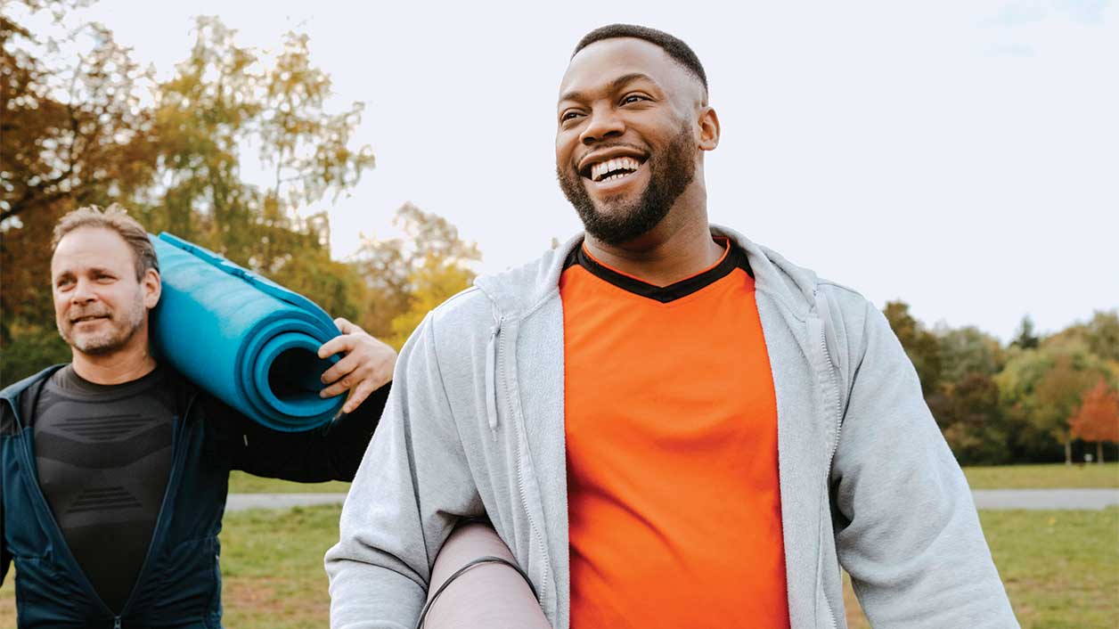 Two men carry exercise mats
