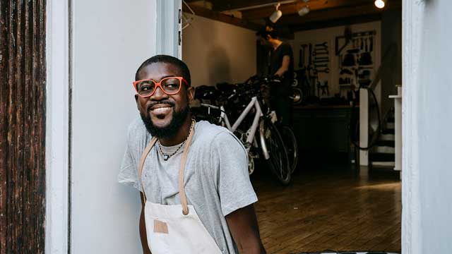 A small business owner smiles