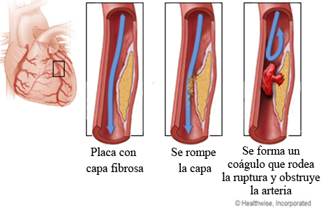 Las placas están cubiertas por una capa fibrosa. Si se produce un aumento repentino de la presión arterial, si la arteria se contrae de repente, o si hay alguna otra cosa como inflamación, la capa fibrosa puede desgarrarse o romperse. El cuerpo trata de reparar el desgarro, muy parecido a como lo hace para detener el sangrado de un corte en la piel, formando un coágulo de sangre sobre el desgarro. El coágulo de sangre puede obstruir totalmente el flujo sanguíneo por la arteria coronaria al músculo cardíaco. Esto causará un ataque al corazón.