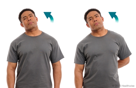 También puede estirar aún más usando una mano para jalar la cabeza hacia el hombro. Por ejemplo, mientras mantiene el hombro derecho bajo, incline la cabeza hacia la izquierda y use la mano izquierda para jalar la cabeza suave y continuamente hacia el hombro.