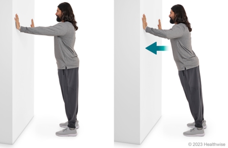 1. Párese mirando hacia la pared con los pies a una distancia de 12 a 24 pulgadas (30 a 60 cm) de la pared. Si siente algo de dolor cuando haga este ejercicio, párese más cerca de la pared.