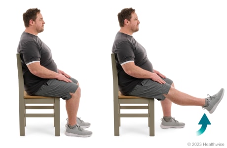 1. En posición sentada en una silla, extienda la pierna y manténgala extendida por 6 segundos. No trabe la rodilla. Luego baje la pierna lentamente.