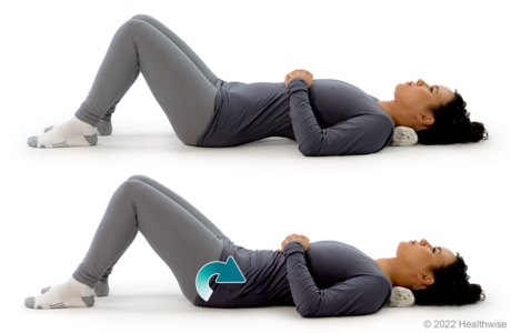 2. Contraiga los músculos abdominales y los glúteos, y presione la región lumbar hacia el piso. Debe sentir que las caderas y la pelvis se mueven hacia atrás.