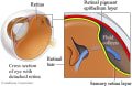 - Se observan vasos sanguíneos dañados o sangrado en la parte posterior del ojo. Esto puede estar causado por enfermedades como presión arterial alta o diabetes.