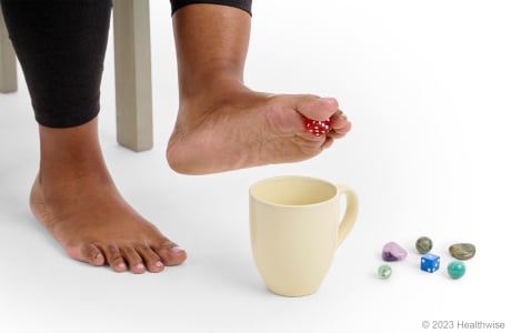 2. Siéntese en una silla y use los dedos del pie afectado para levantar uno de los objetos del suelo. Luego, trate de meter el objeto en la taza.