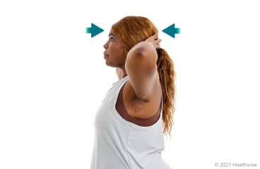 Si desea estirar un poco más, colóquese el brazo detrás de la espalda. Use el brazo contrario de la dirección adonde inclina la cabeza. Por ejemplo, si inclina la cabeza hacia la izquierda, póngase el brazo derecho detrás de la espalda.