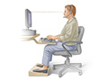 - Utilice una buena postura al estar sentado. Relaje los hombros, mantenga los pies planos sobre el suelo y evite inclinarse para acercarse a las tareas sobre su escritorio.