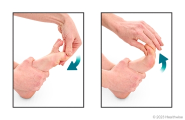 Con el pulgar y el dedo índice (el que señala) de la otra mano, flexione lentamente el dedo del pie hacia delante y luego hacia atrás. Mantenga cada posición durante unos 15 segundos.