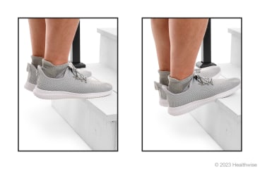 Deje caer los talones sobre el borde del escalón mientras relaja los músculos de la pantorrilla. Debe sentir un estiramiento suave a lo largo de la parte trasera de la pierna hasta la rodilla.