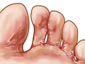 Las infecciones interdigitales se presentan entre los dedos de los pies, especialmente entre el cuarto y el quinto dedo. Este es el tipo más común de infección del pie de atleta.