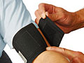 - Envuelva el manguito de presión arterial alrededor de la parte superior desnuda del brazo. El borde inferior del manguito debe quedar aproximadamente a 1 pulgada (2.5 cm) por encima del pliegue del codo.