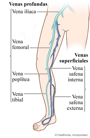 Las venas profundas de las piernas (las venas de color azul claro en la imagen) incluyen las venas ilíacas, femorales, poplíteas y tibiales. Las venas superficiales de las piernas (las venas de color azul oscuro) incluyen las venas safenas internas y externas.